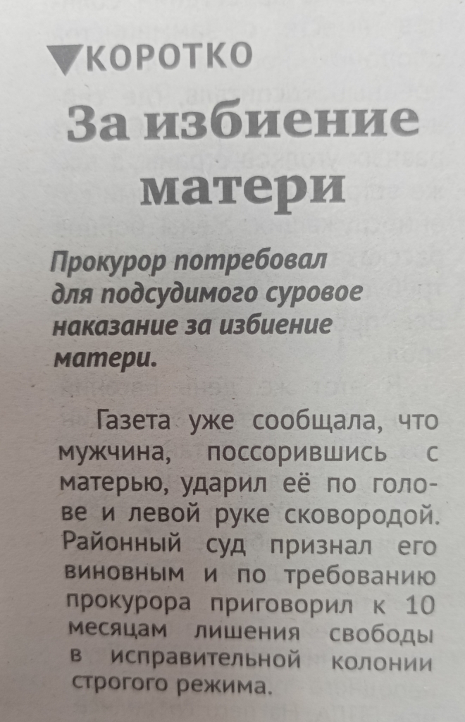 Читайте статью "За избиение матери" в очередном выпуске газеты "Прогресс-Т"версия для печати
