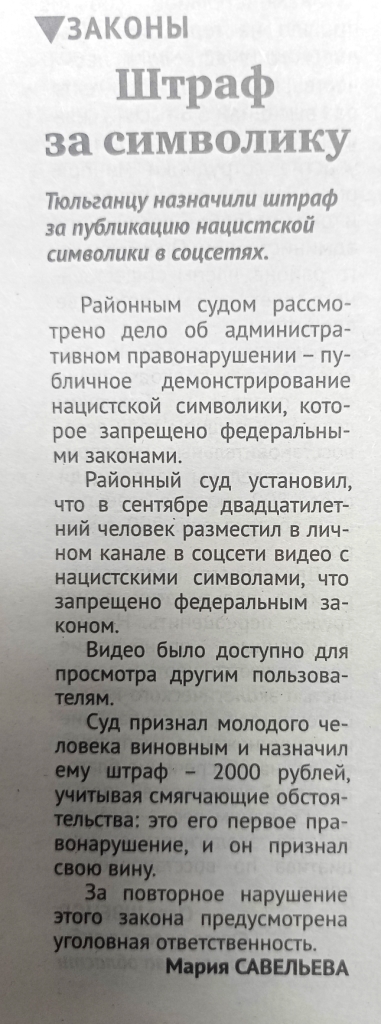 Читайте статью "Штраф за символику" в очередном выпуске газеты "Прогресс-Т"версия для печати