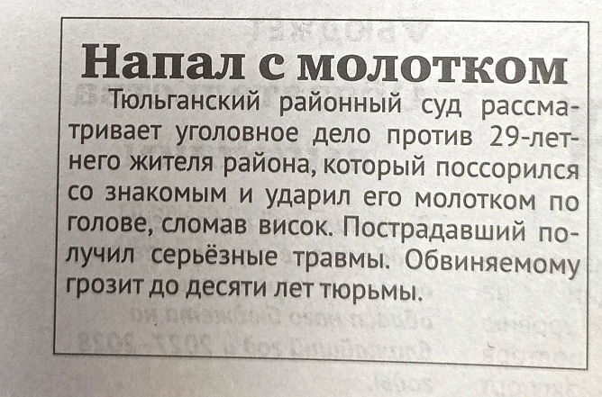 Читайте статью "Напал с молотком" в очередном выпуске газеты "Прогресс-Т"версия для печати